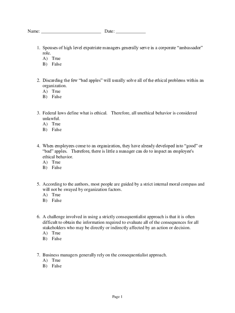 Name: ___ Date: ___ 1. Spouses of high level expatriate managers generally serve in a corporate ambassador role. A) True B) False 2. Discarding the few bad apples will usually solve all the ethical