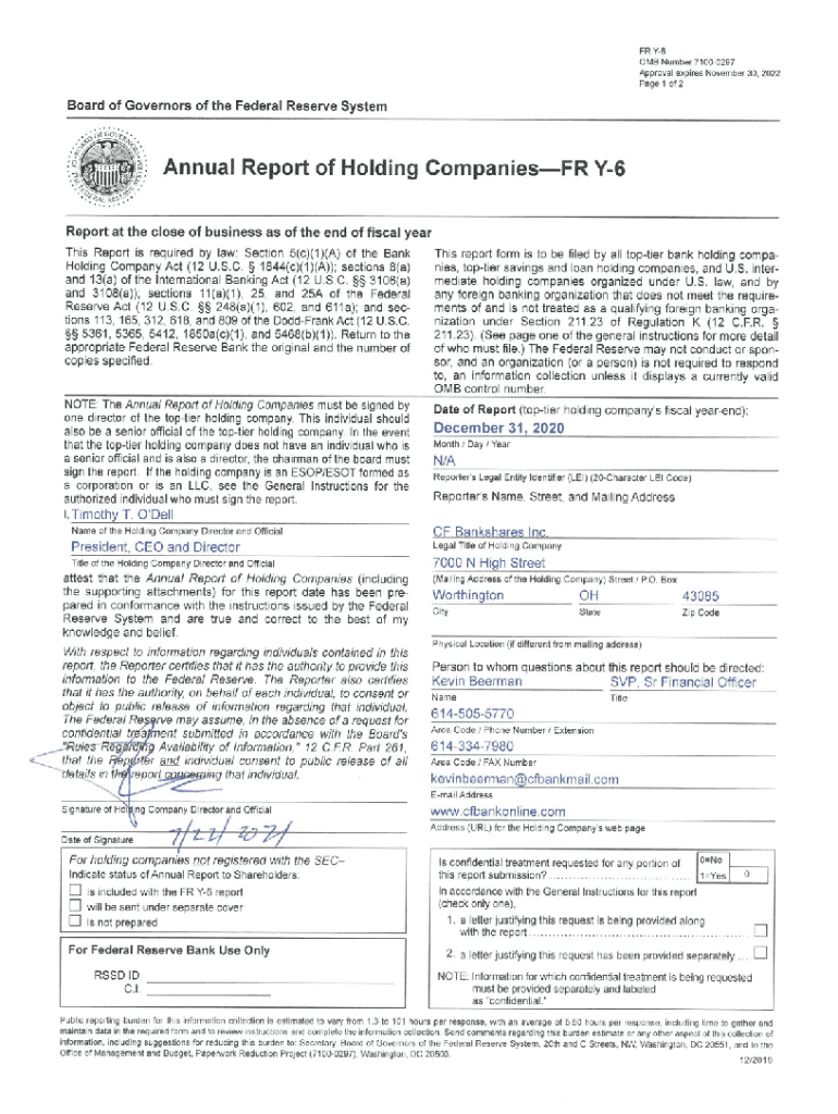 Form FR Y6 Central Federal Corporation Fiscal Year Ending December 31, 2020, Reportable Item 3: Securities holders(1)(a)(b)(c) and (2)(a)(b)(c)Current Securities Holders with ownership, control or