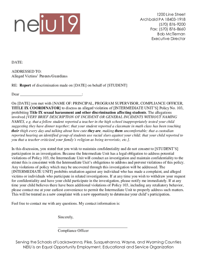 1200 Line Street Archibald PA 184031918 (570) 8769200 Fax: (570) 8768660 Bob McTiernan Executive Directorate: ADDRESSED TO: Alleged Victims Parents/Guardians RE: Report of discrimination made on [DATE]