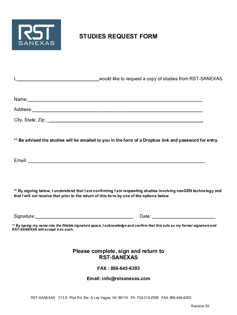 STUDIES REQUEST FORM, would like to request a copy of studies from RSTSANEXAS. Name: Address: City, State, Zip: _** Be advised the studies will be emailed to you in the form of a Dropbox link and