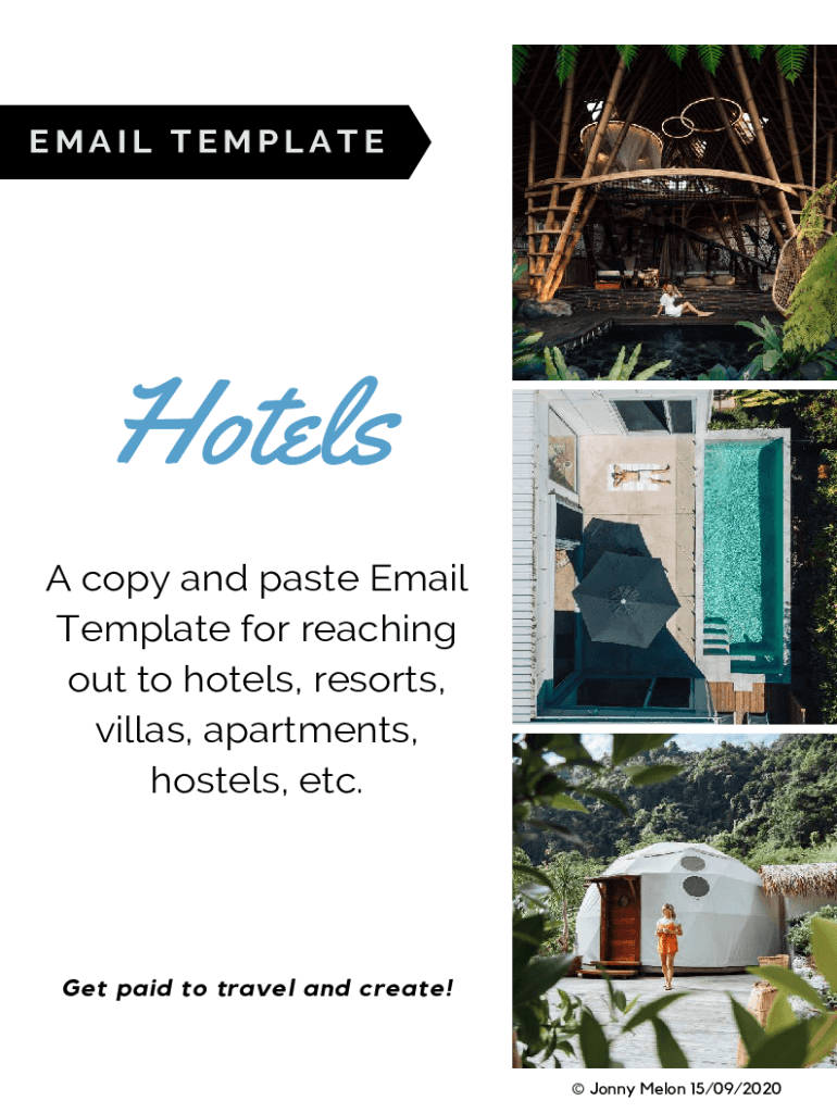 EMAIL TEMPLATEHotels A copy and paste Email Template for reaching out to hotels, resorts, villas, apartments, hostels, etc. Get paid to travel and create! Jonny Melon 15/09/2020To whom it may concern