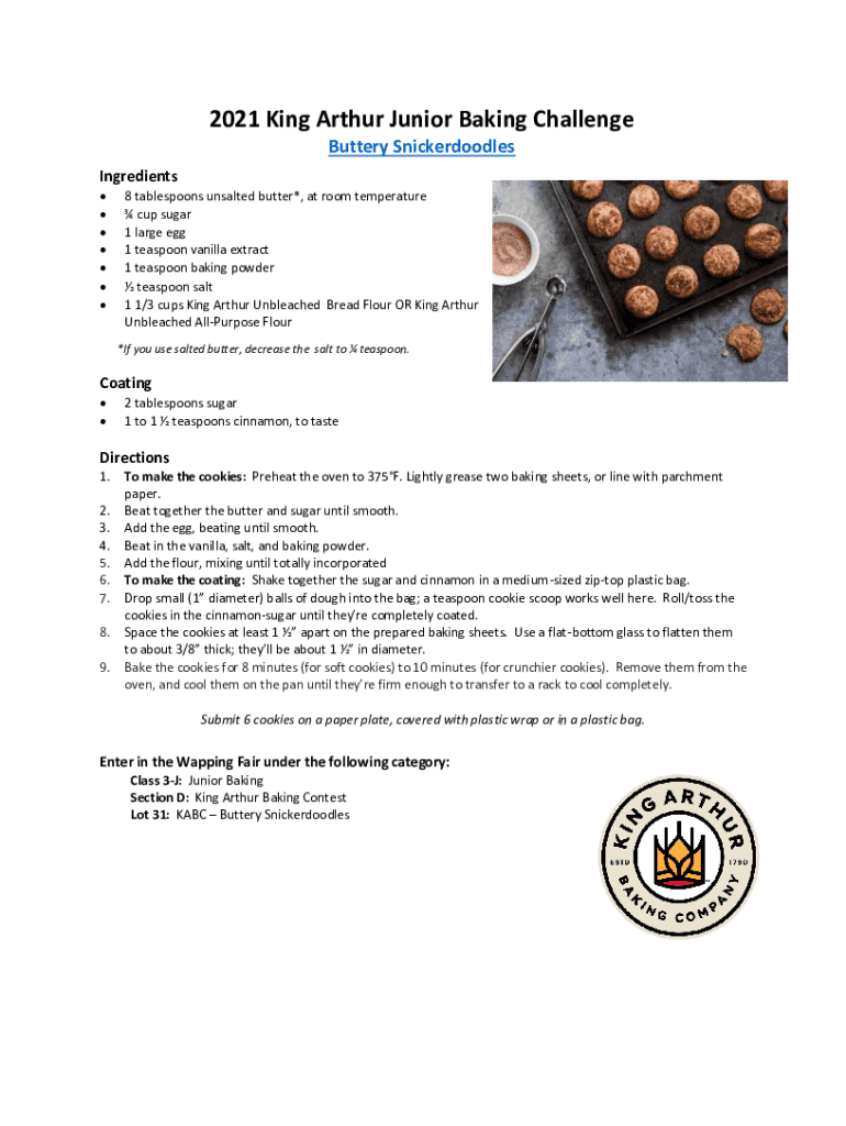 2021 King Arthur Junior Baking Challenge Buttery Snicker doodles Ingredients 8 tablespoons unsalted butter×, at room temperature cup sugar 1 large egg 1 teaspoon vanilla extract 1 teaspoon baking