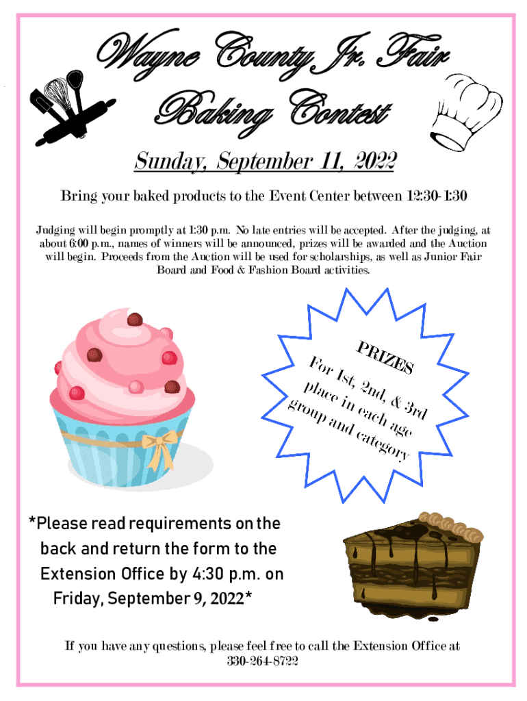 Wayne County Jr. Fair Baking Contest Sunday, September 11, 2022, Bring your baked products to the Event Center between 12:301:30 Judging will begin promptly at 1:30 p.m. No late entries will be accepted.