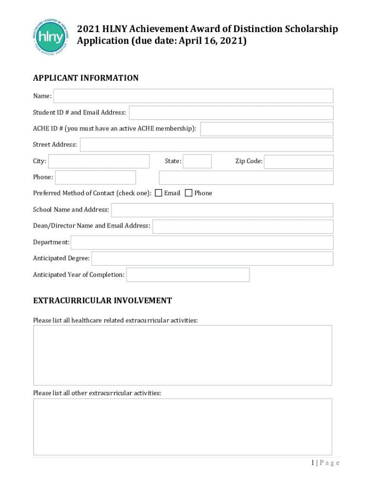 2021 HL NY Achievement Award of Distinction ScholarshipApplication (due date: April 16, 2021)APPLICANT Informational:Student ID # and Email Address:ACHE ID # (you must have an active ACHE membership):Street