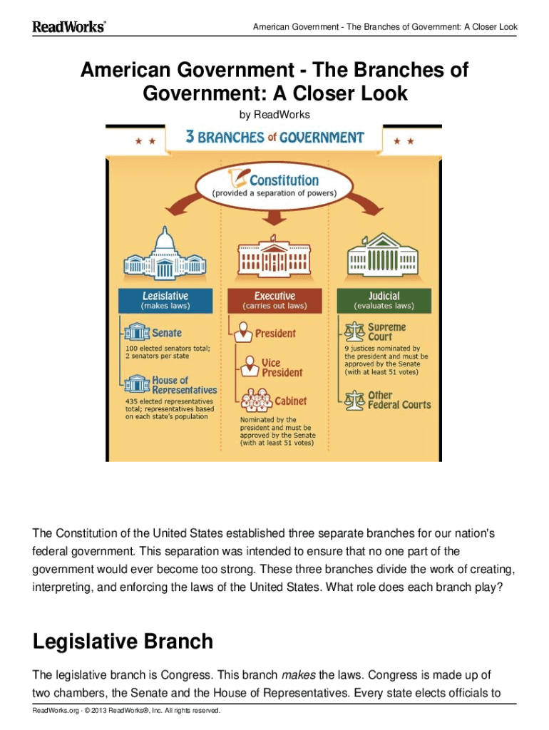 American Government The Branches of Government: A Closer Look American Government The Branches of Government: A Closer Look by ReadWorksThe Constitution of the United States established three separate