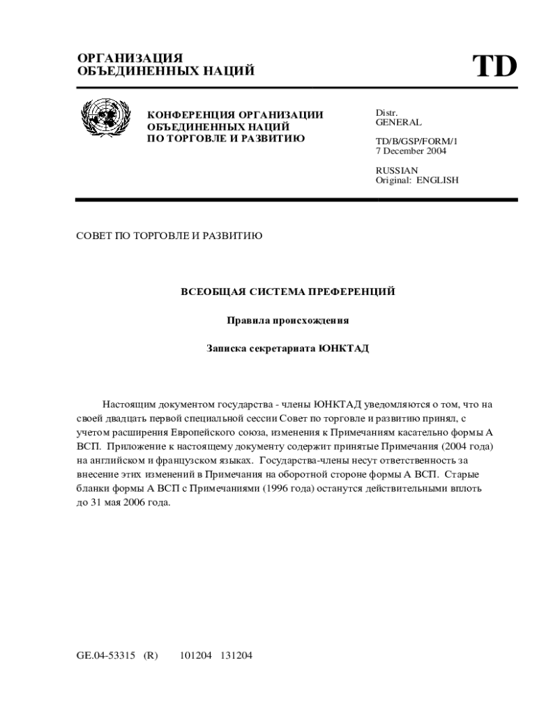 TD Dist. GENERAL TD/B/GSP/FORM/1 7 December 2004 RUSSIAN Original: ENGLISH.