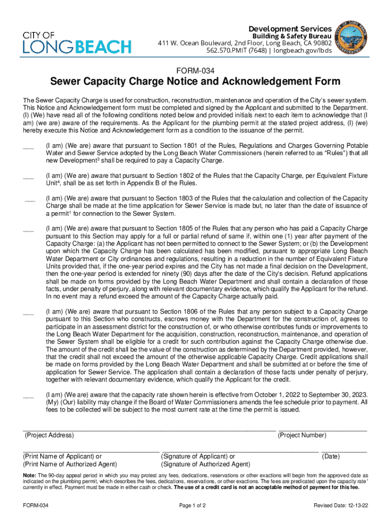 Development ServicesBuilding & Safety Bureau 411 W. Ocean Boulevard, 2nd Floor, Long Beach, CA 90802 562.570.PIT (7648) | longbeach.gov/lbdsFORM034Sewer Capacity Charge Notice and Acknowledgement