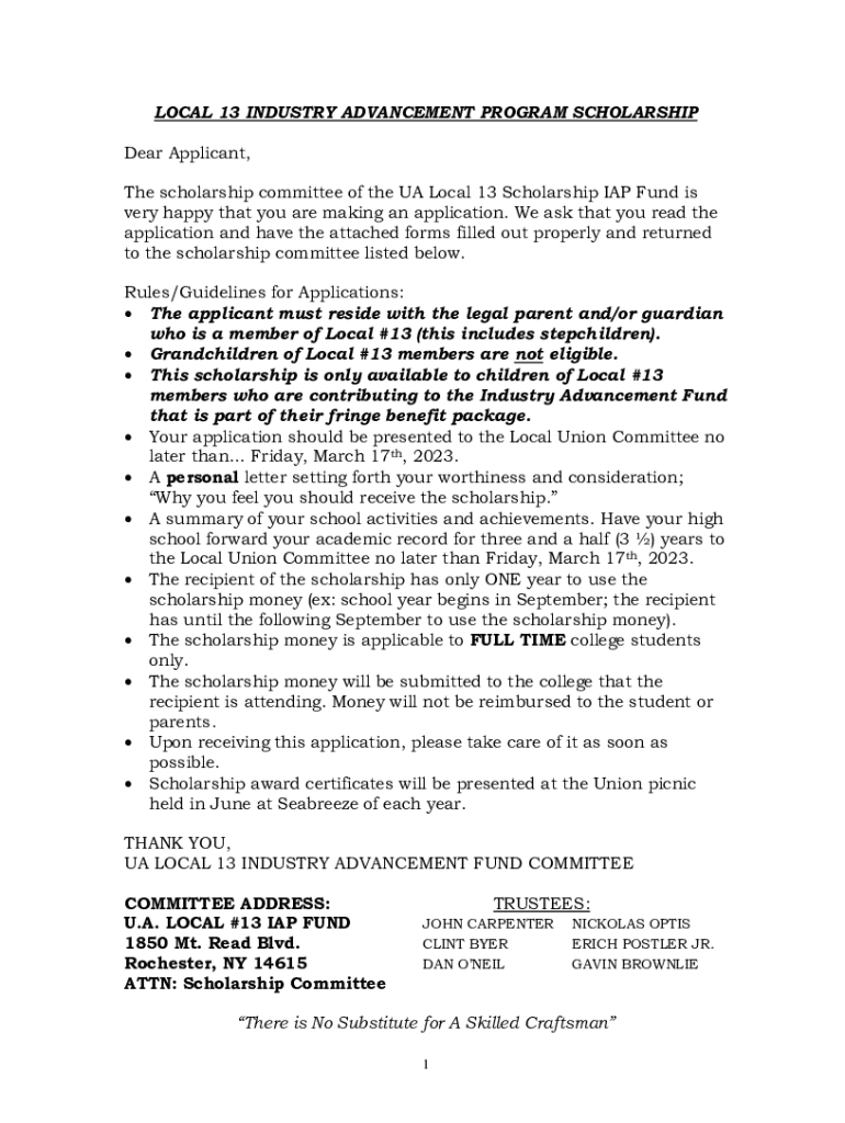 LOCAL 13 INDUSTRY ADVANCEMENT PROGRAM SCHOLARSHIP Dear Applicant, The scholarship committee of the UA Local 13 Scholarship IAP Fund is very happy that you are making an application. We ask that you