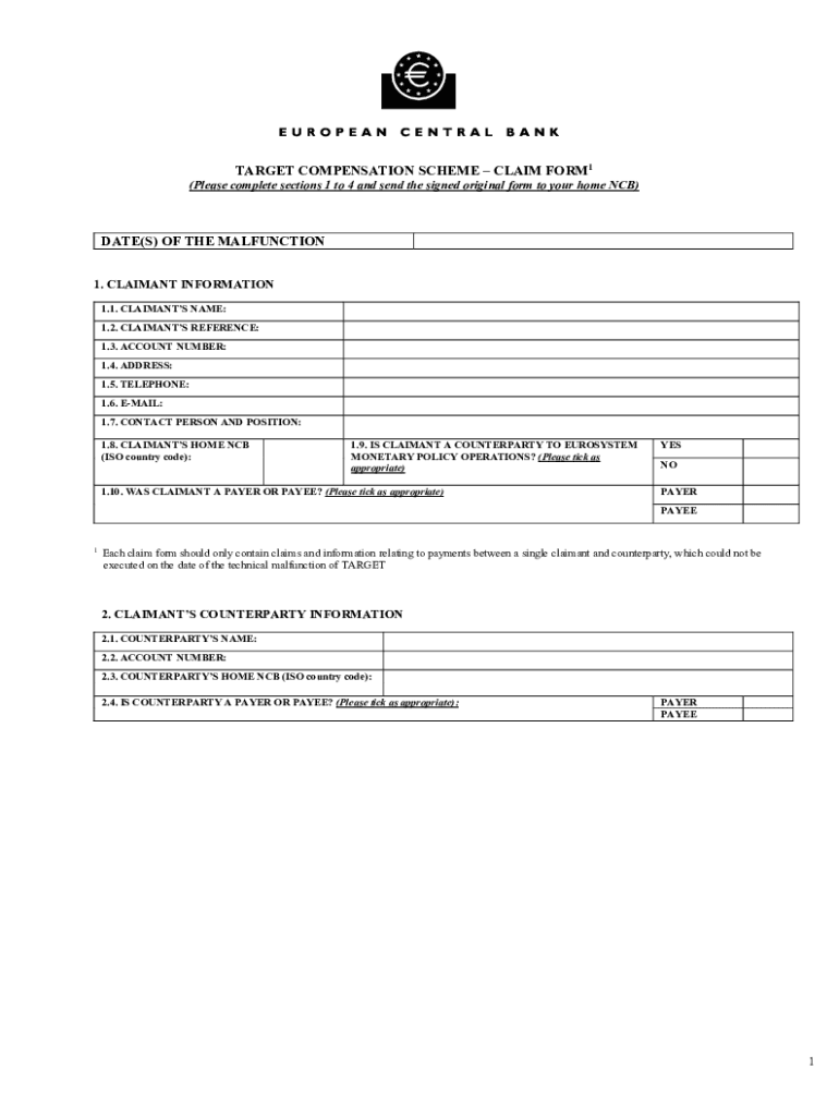 TARGET COMPENSATION SCHEME CLAIM FORM1(Please complete sections 1 to 4 and send the signed original form to your home NCB)DATE(S) OF THE MALFUNCTION 1. CLAIMANT INFORMATION 1.1. CLAIMANTS NAME: 1.2.