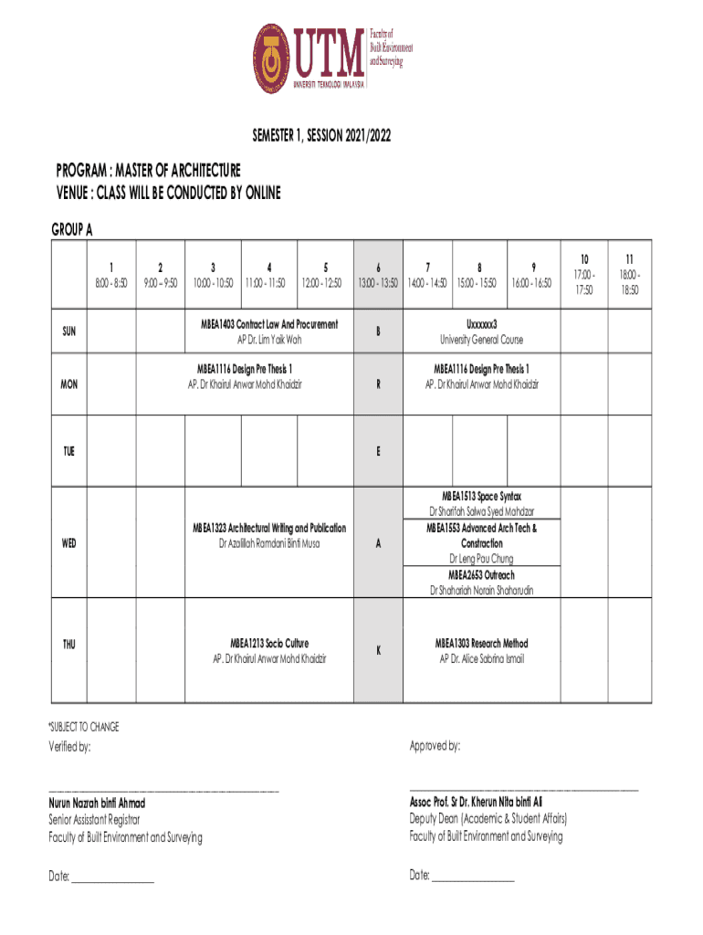 SEMESTER 1, SESSION 2021/2022PROGRAM : MASTER OF ARCHITECTURE VENUE : CLASS WILL BE CONDUCTED BY ONLINE GROUP A 1 8:00 8:502 9:00 9:50SUNMON3 10:00 10:504 11:00 11:505 12:00 12:50MBEA1403 Contract