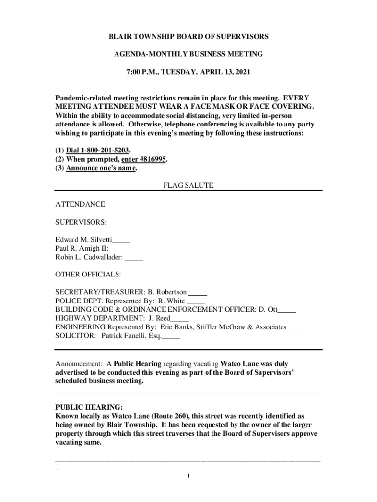 BLAIR TOWNSHIP BOARD OF SUPERVISORS AGENDAMONTHLY BUSINESS MEETING 7:00 P.M., TUESDAY, APRIL 13, 2021Pandemicrelated meeting restrictions remain in place for this meeting. EVERY MEETING ATTENDEE MUST