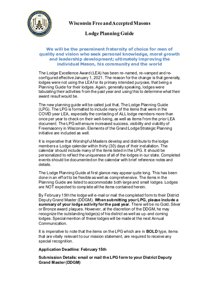 Wisconsin Free and Accepted Masons Lodge Planning Guide We will be the preeminent fraternity of choice for men of quality and vision who seek personal knowledge, moral growth and leadership development;