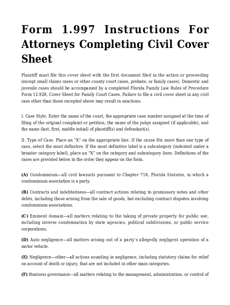 Form 1.997 Instructions For Attorneys Completing Civil Cover Sheet Plaintiff must file this cover sheet with the first document filed in the action or proceeding (except small claims cases or other
