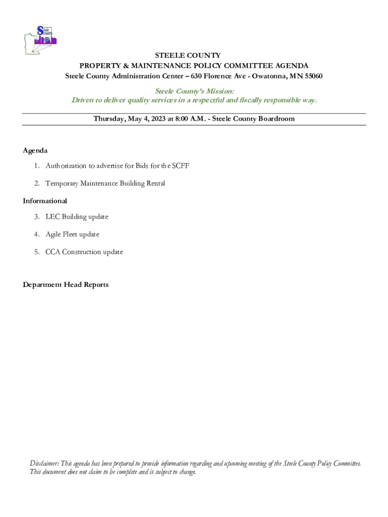 STEELE COUNTY PROPERTY & MAINTENANCE POLICY COMMITTEE AGENDA Steele County Administration Center 630 Florence Ave Madonna, MN 55060Steele Counties Mission: Driven to deliver quality services in a