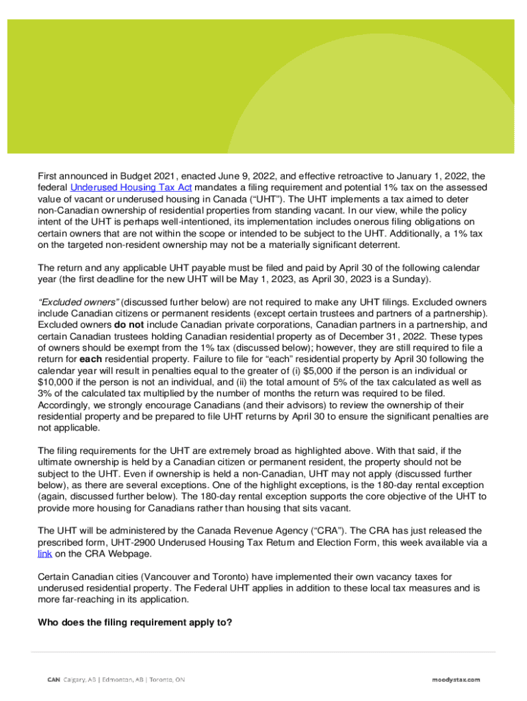 First announced in Budget 2021, enacted June 9, 2022, and effective retroactive to January 1, 2022, the federal Underused Housing Tax Act mandates a filing requirement and potential 1% tax on the