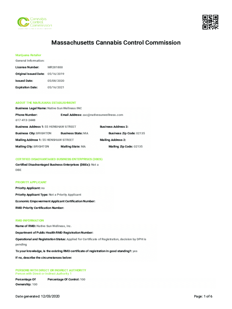 Massachusetts Cannabis Control Commission Marijuana Retailer General Information: License Number:MR281800Original Issued Date: 05/16/2019 Issued Date:05/08/2020Expiration Date:05/16/2021ABOUT THE