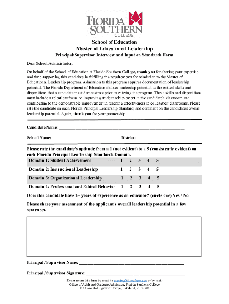 School of Education Master of Educational Leadership Principal/Supervisor Interview and Input on Standards Form Dear School Administrator, On behalf of the School of Education at Florida Southern