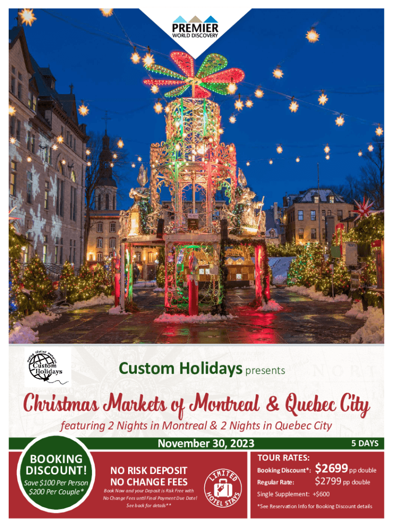 Custom Holidays presents Christmas Markets of Montreal & Quebec City featuring 2 Nights in Montreal & 2 Nights in Quebec City 5 DAYS November24, 30, 2021 2023 September TOUR RATES: BOOKING Discount*:$2699