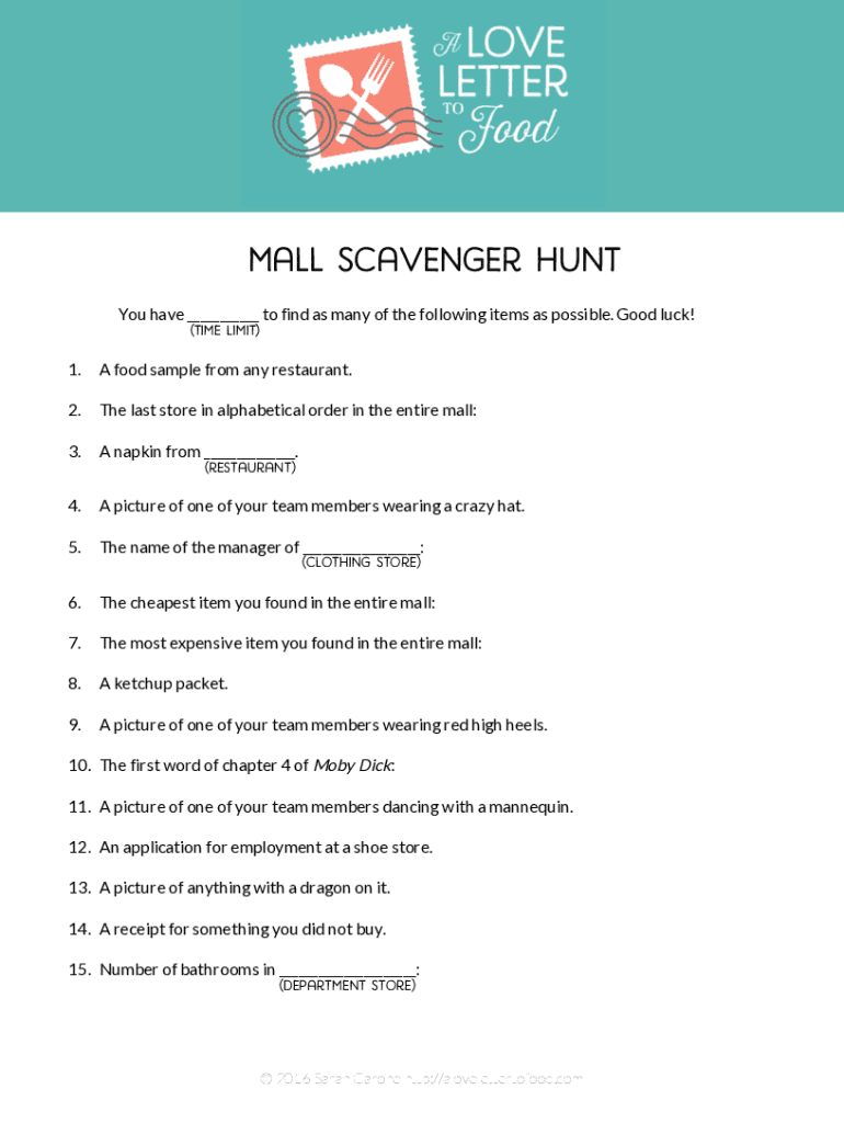 Mall Scavenger Hunt You have ___ to find as many of the following items as possible. Good luck! (time limit)1. A food sample from any restaurant.2. The last store in alphabetical order in the entire