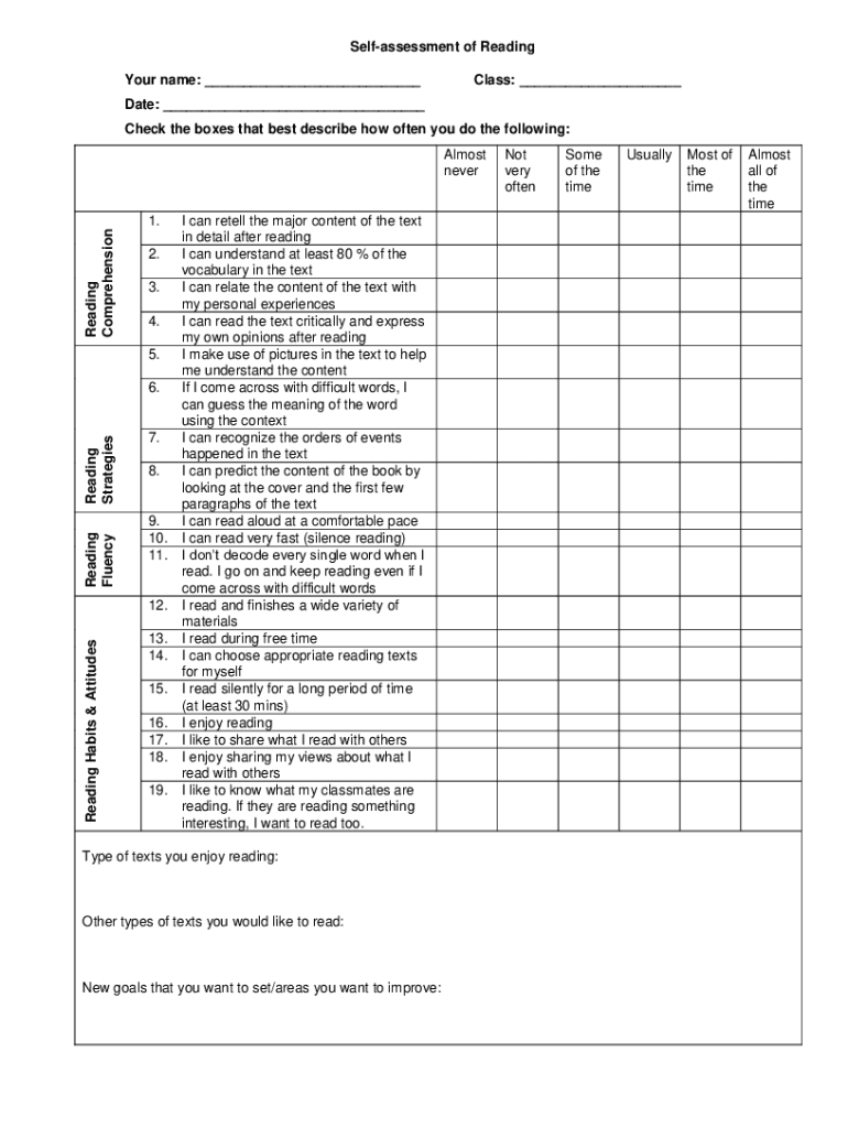 Self assessment of Reading Your name: ___Class: ___Date: ___ Check the boxes that best describe how often you do the following: Almost never Reading Comprehension1. 2. 3. 4. 5. Reading Fluency Reading