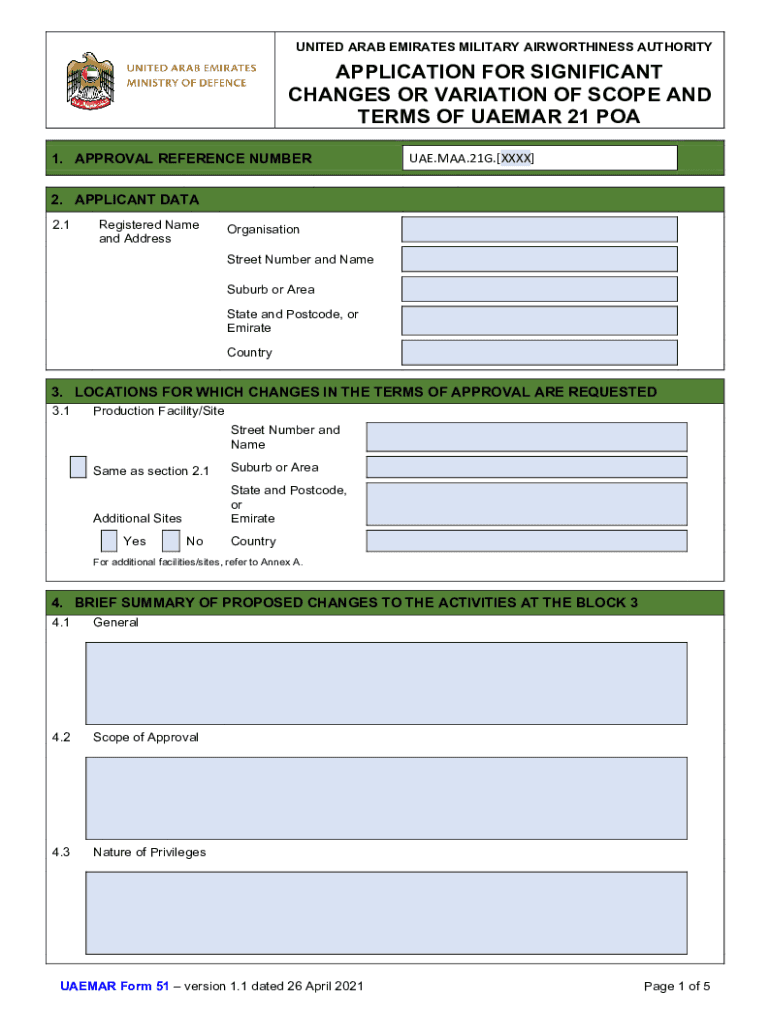 UNITED ARAB EMIRATES MILITARY AIRWORTHINESS AUTHORITYAPPLICATION FOR SIGNIFICANT CHANGES OR VARIATION OF SCOPE AND TERMS OF UAE MAR 21 POA 1. APPROVAL REFERENCE NUMBER UAE.MAY.21G.[XXX]2. APPLICANT