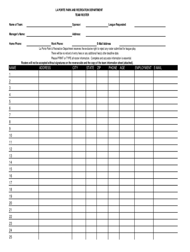 LA PORT PARK AND RECREATION DEPARTMENT TEAM ROSTER Name of Team:Sponsor:Manager\'s Name:Address:League Requested:Home Phone:Work Phone: Email Address La Port Park & Recreation Department reserves