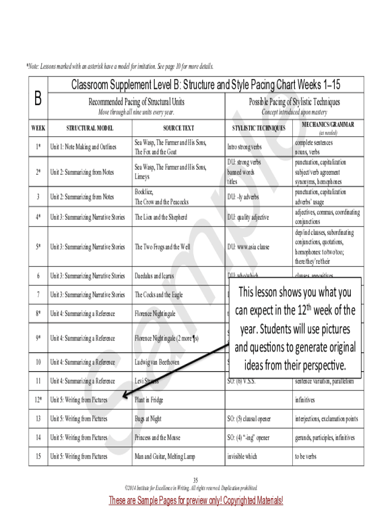 *Note: Lessons marked with an asterisk have a model for imitation. See page 10 for more details.WEEKRecommended Pacing of Structural UnitsPossible Pacing of Stylistic TechniquesMove through all nine