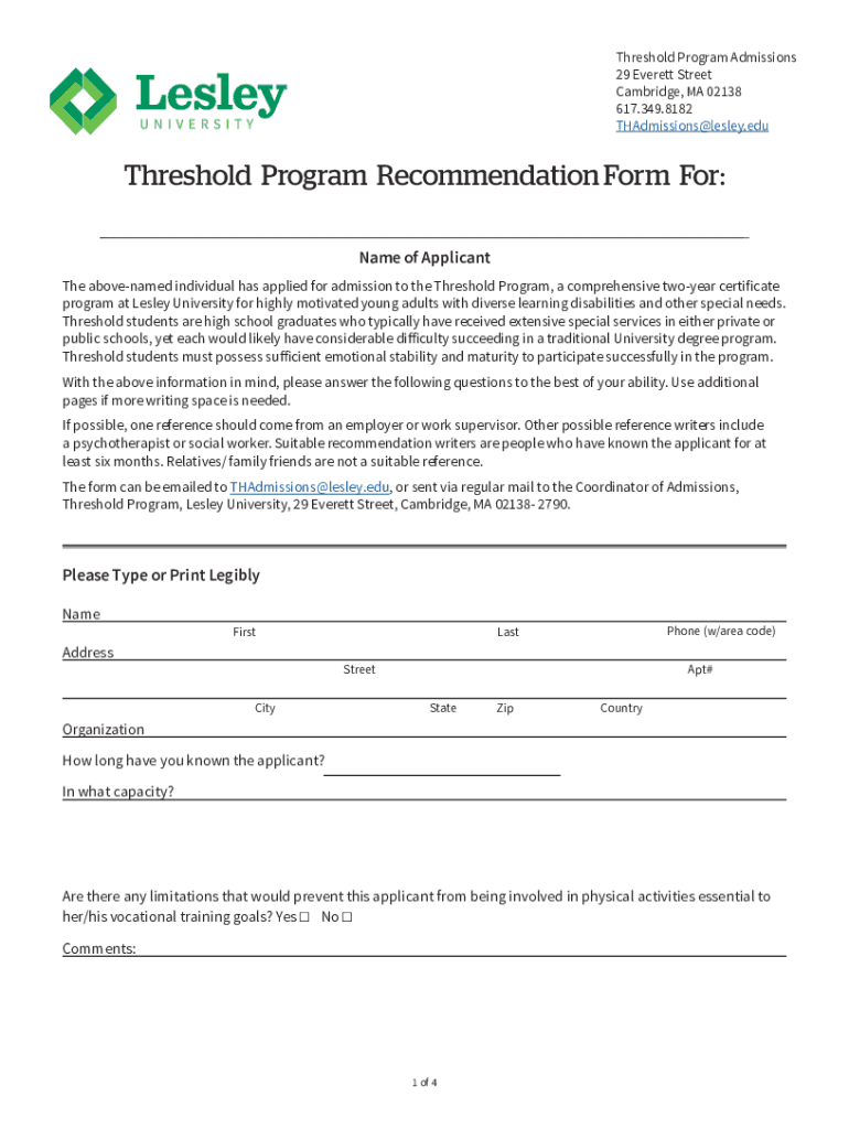Threshold Program Admissions 29 Everett Street Cambridge, MA 02138 617.349.8182 THAdmissions@lesley.eduThreshold Program Recommendation Form For: ___ ___ ___ ___Name of Applicant The above named individual
