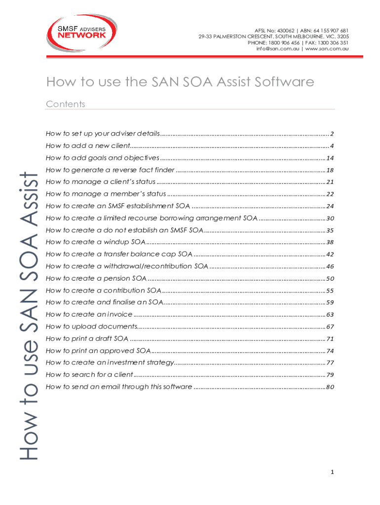 ADSL No: 430062 | ABN: 64 155 907 681 2933 PALMERSTON CRESCENT, SOUTH MELBOURNE, VIC, 3205 Phones: 1800 906 456 | FAX: 1300 306 351 info@san.com.au | www.san.com.auHow to use the SAN SOA Assist Software