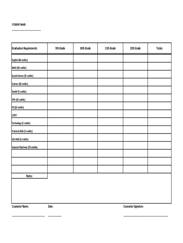 STUDENT NAME: ___Graduation Requirements9th Grade10th Grade11th Grade12th GradeTotalsEnglish (40 credits) Math (30 credits) Social Science (35 credits) Science (30 credits) Health (5 credits) VIA