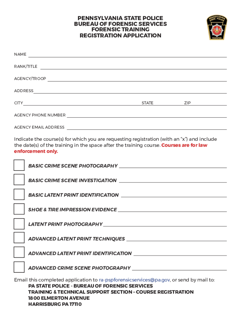 PENNSYLVANIA STATE POLICE BUREAU OF FORENSIC SERVICES FORENSIC TRAINING REGISTRATION APPLICATION NAME RANK/TITLE AGENCY/TROOP ADDRESS CITYSTATEZIP AGENCY PHONE NUMBER AGENCY EMAIL ADDRESSIndicate