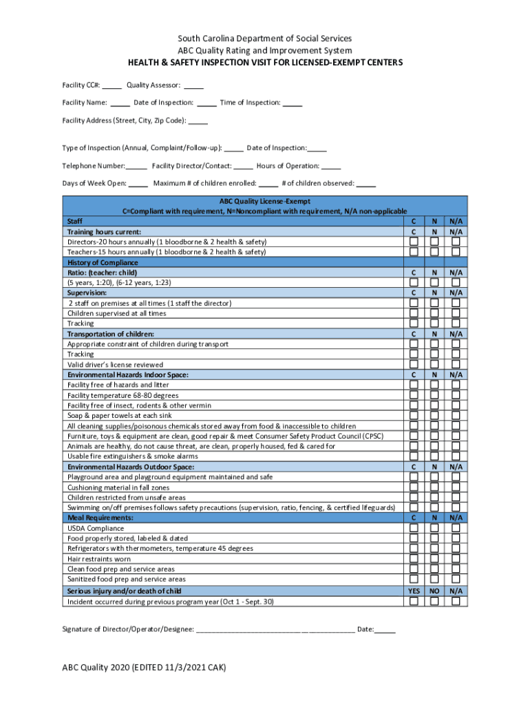 South Carolina Department of Social Services ABC Quality Rating and Improvement System HEALTH & SAFETY INSPECTION VISIT FOR LICENSEDEXEMPT CENTERS Facility CC#:Quality Assessor:Facility Name:Date