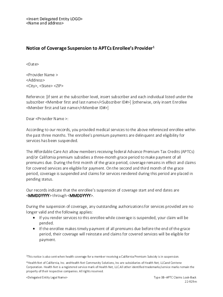 Insert Delegated Entity LOGO Name and addressNotice of Coverage Suspension to APT Cs Enrolled Provider1 Date Provider Name Address City, State ZIP Reference: [if sent at the subscriber level, insert