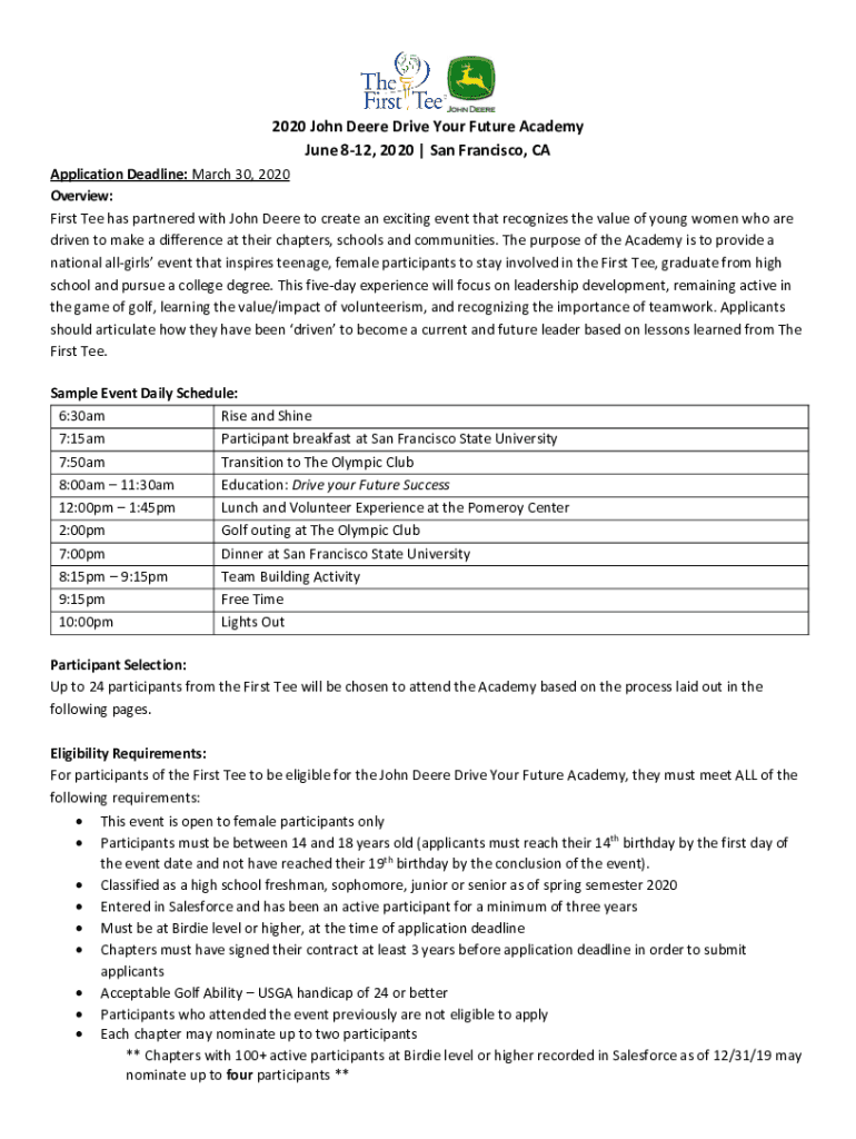 2020 John Deere Drive Your Future Academy June 812, 2020 | San Francisco, CA Application Deadline: March 30, 2020, Overview: First Tee has partnered with John Deere to create an exciting event that