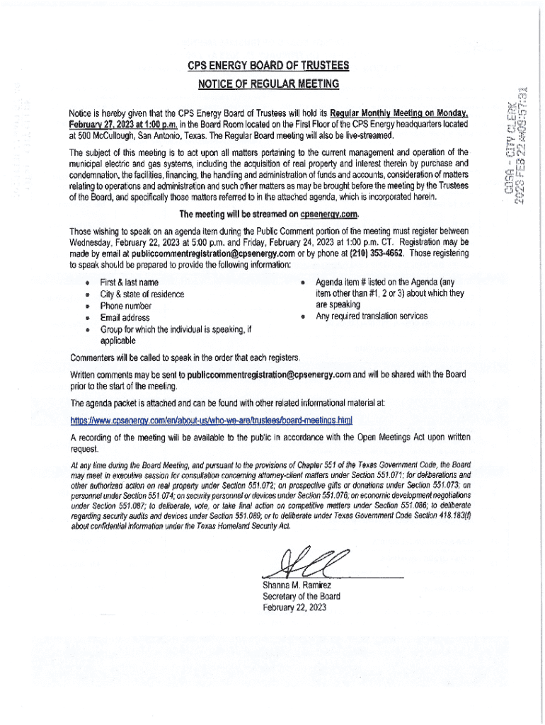 FEBRUARY 27, 2023, BOARD MEETING UPDATE ON CHAIR\'S PRIORITIES CPS ENERGY BOARD OF TRUSTEES