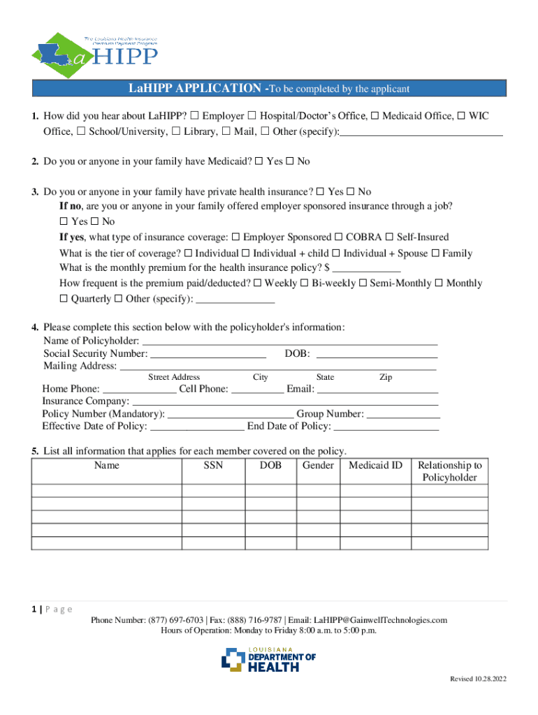 Form Louisiana health insurance can be filled out online or by mail. It requires information about the individual or employer providing health insurance coverage.