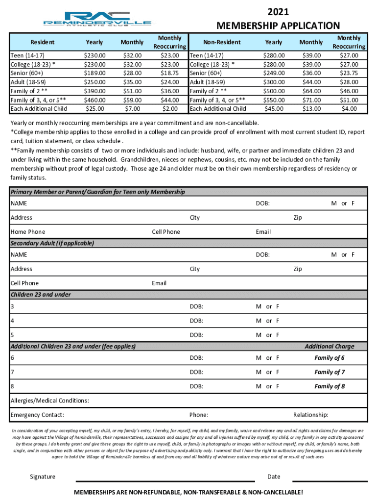 2021 MEMBERSHIP APPLICATION Resident Teen (1417) College (1823) * Senior (60+) Adult (1859) Family of 2 ** Family of 3, 4, or 5** Each Additional ChildYearlyMonthly$$$230.00230.00$$189.00250.00$$390.00460.00$$25.0032.00$$32.0028.00$$35.0051.00$59.007.00Monthly
