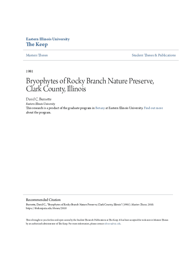 Eastern Illinois University Keep Masters ThesesStudent Theses & Publications1981Bryophytes of Rocky Branch Nature Preserve, Clark County, Illinois David C. Burnett Eastern Illinois UniversityThis