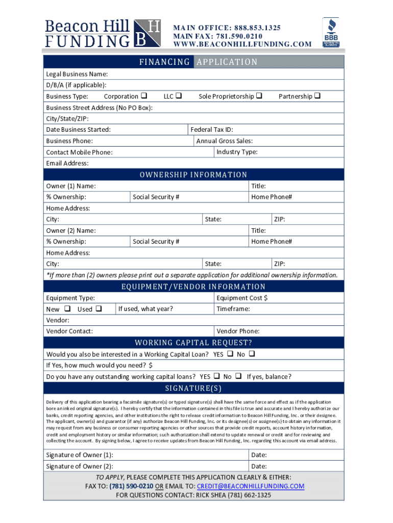 MAIN OFFICE: 888.853. 1325 MAIN Faxes : 781.590. 0210 WWW.BEACONHILLFUNDING.FINANCING APPLICATION Legal Business Name: D/B/A (if applicable): Business Type: Corporation Business Street Address (No