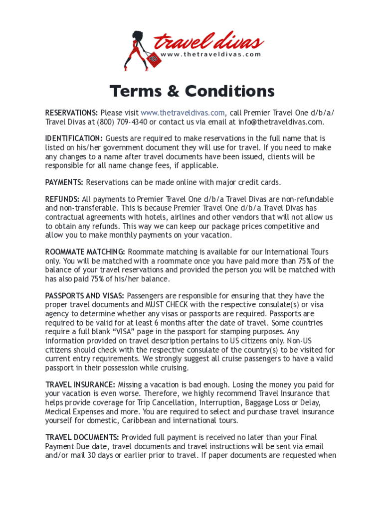 Terms & Conditions RESERVATIONS: Please visit www.thetraveldivas.com, call Premier Travel One d/b/a/ Travel Divas at (800) 7094340 or contact us via email at info@thetraveldivas.com. IDENTIFICATION:
