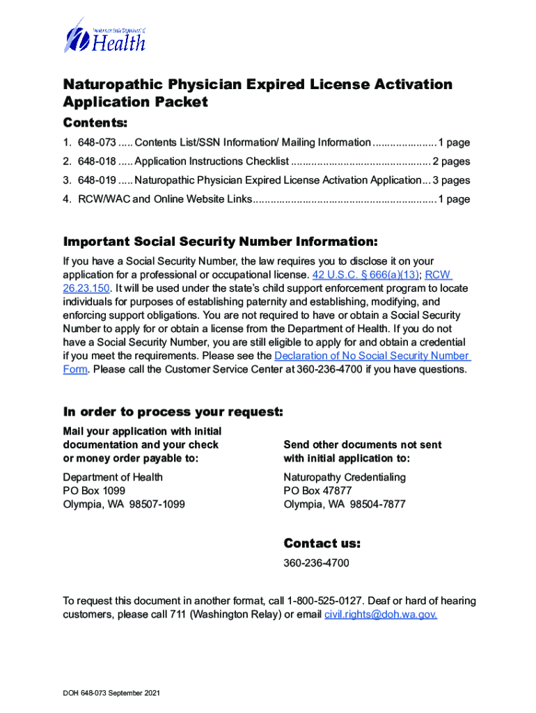 Naturopathic Physician Expired License Activation Application Packet Contents: 1. 648073...... Contents List/SSN Information/ Mailing Information....................... 1 page 2. 648018...... Application