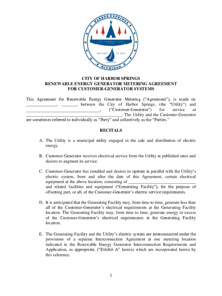 CITY OF HARBOR SPRINGS RENEWABLE ENERGY GENERATOR METERING AGREEMENT FOR CUSTOMERGENERATOR SYSTEMS This Agreement for Renewable Energy Generator Metering (Agreement), is made on ___, ___, between