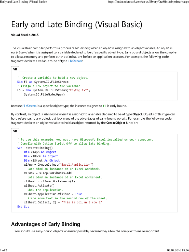 Early and Late Binding (Visual Basic)1 of 2https://msdn.microsoft.com/enus/library/0tcf61s1(dprinter).asexually and Late Binding (Visual Basic) Visual Studio 2015 The Visual Basic compiler performs