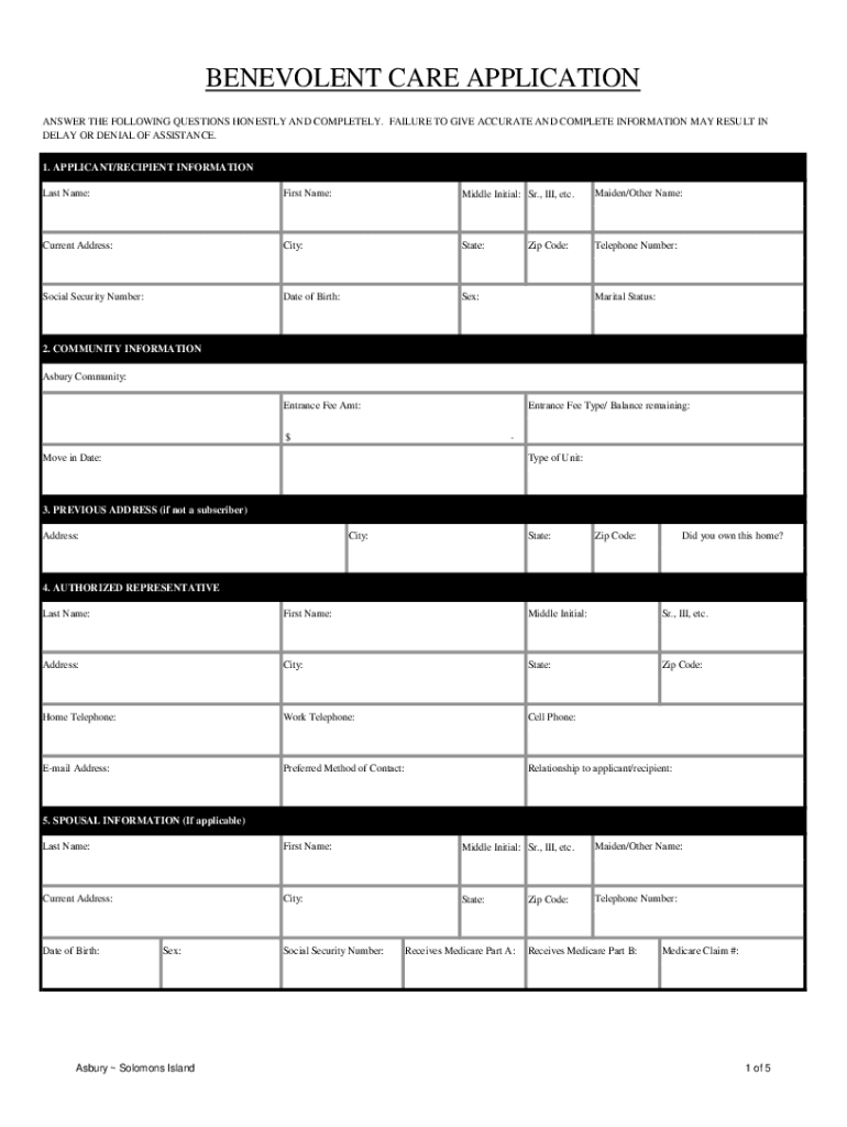 BENEVOLENT CARE APPLICATION ANSWER THE FOLLOWING QUESTIONS HONESTLY AND COMPLETELY. FAILURE TO GIVE ACCURATE AND COMPLETE INFORMATION MAY RESULT IN DELAY OR DENIAL OF ASSISTANCE. 1. APPLICANT/RECIPIENT