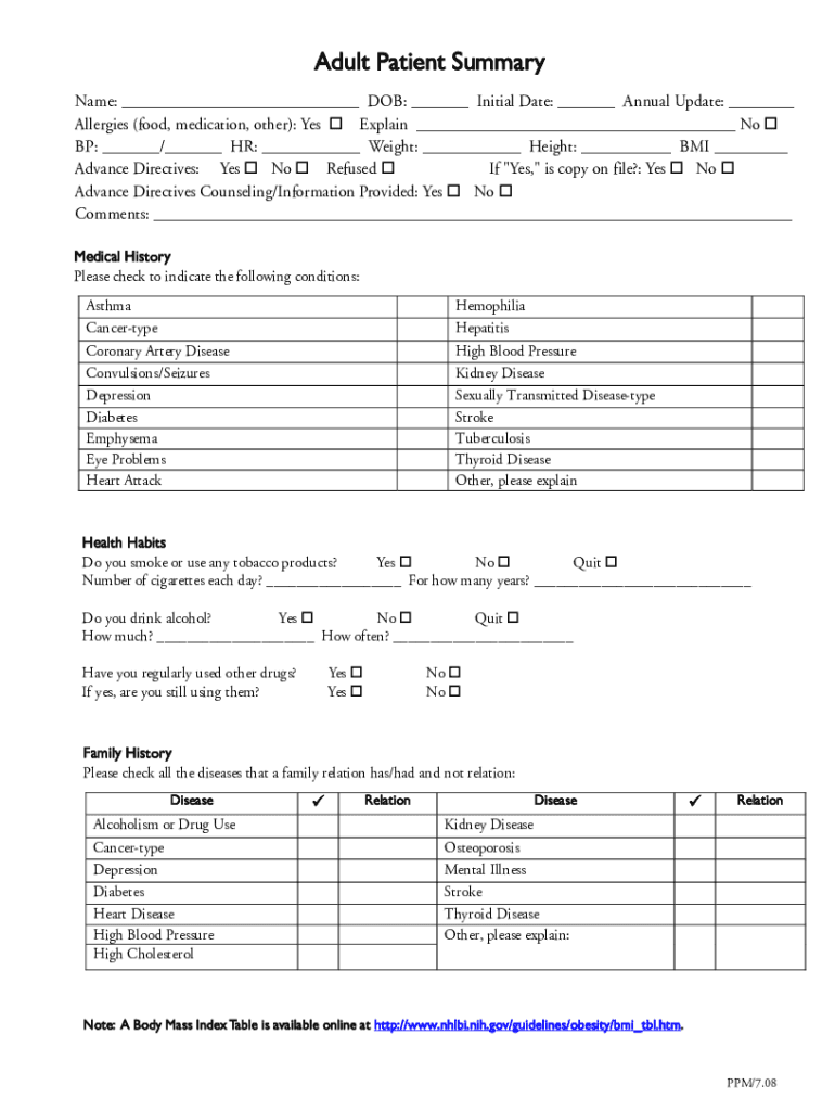 Adult Patient Summary Name: ___ DOB: ___ Initial Date: ___ Annual Update: ___ Allergies (food, medication, other): Yes Explain ___ No BP: ___/___ HR: ___ Weight: ___ Height: ___ BMI ___ Advance Directives: