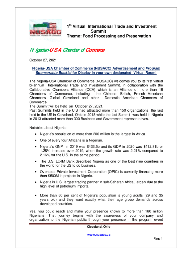 1st Virtual International Trade and Investment Summit Theme: Food Processing and PreservationNigerianUSA Chamber of Commerce October 27, 2021, Nigeria USA Chamber of Commerce (NUS ACC) Advertisement