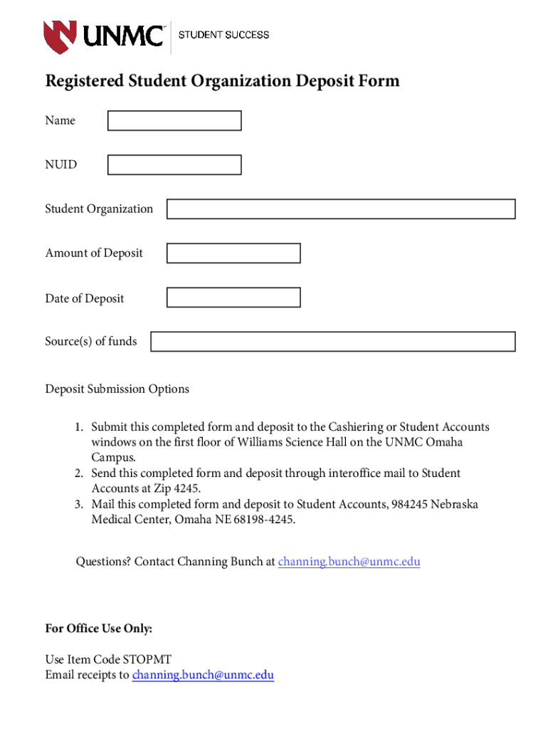 Registered Student Organization Deposit Form Name QUID Student Organization Amount of Deposit Date of Deposit Source(s) of funds Deposit Submission Options 1. Submit this completed form and deposit