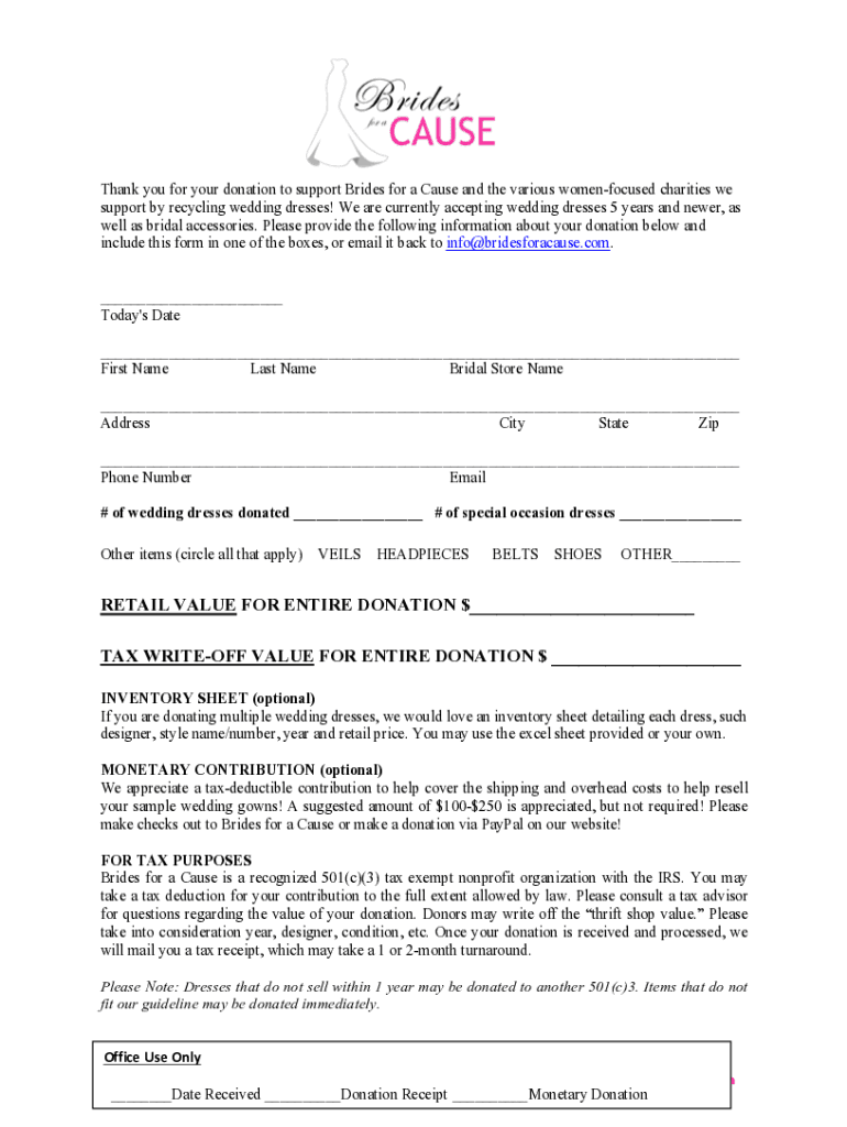 Thank you for your donation to support Brides for a Cause and the various women focused charities we support by recycling wedding dresses! We are currently accepting wedding dresses 5 years and newer,