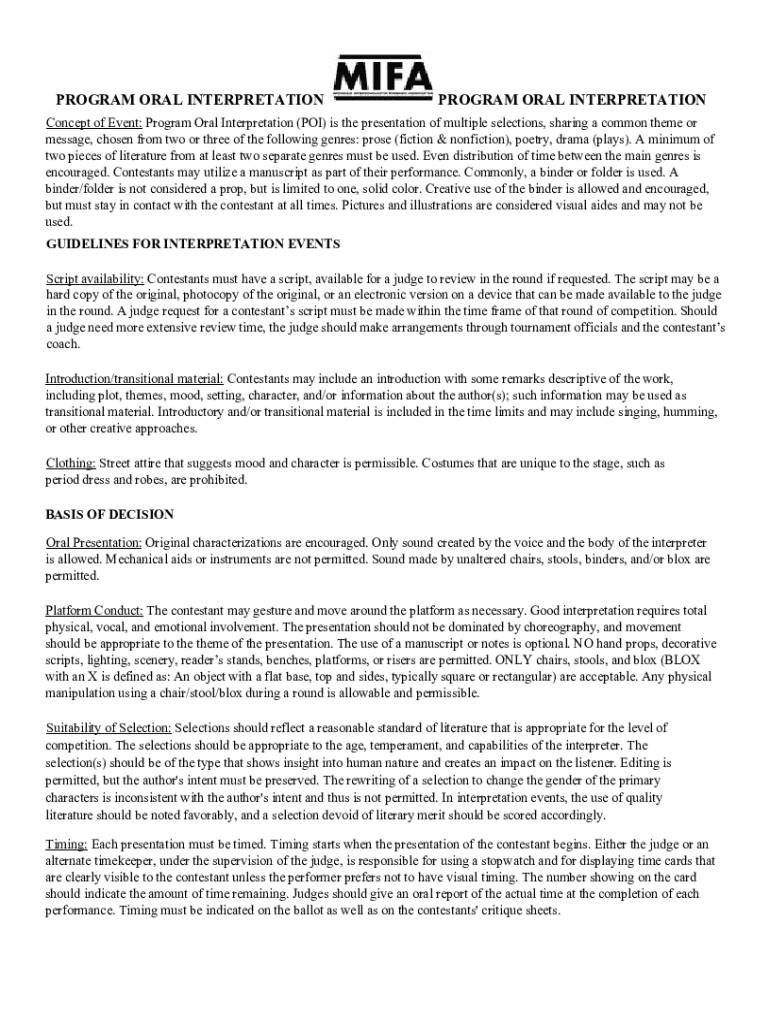 PROGRAM ORAL INTERPRETATIONPROGRAM ORAL INTERPRETATIONConcept of Event: Program Oral Interpretation (POI) is the presentation of multiple selections, sharing a common theme or message, chosen from