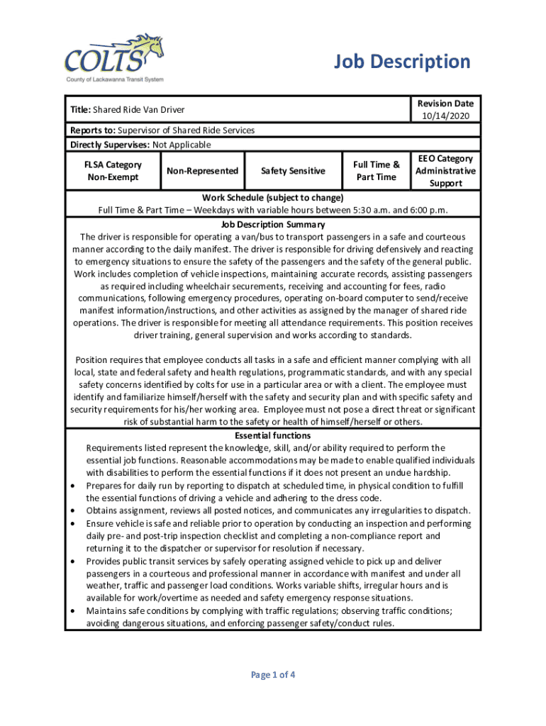 Job Description Revision Date 10/14/2020Title: Shared Ride Van Driver Reports to: Supervisor of Shared Ride Services Directly Supervises: Not Applicable FLEA Category NonExemptNonRepresentedSafety